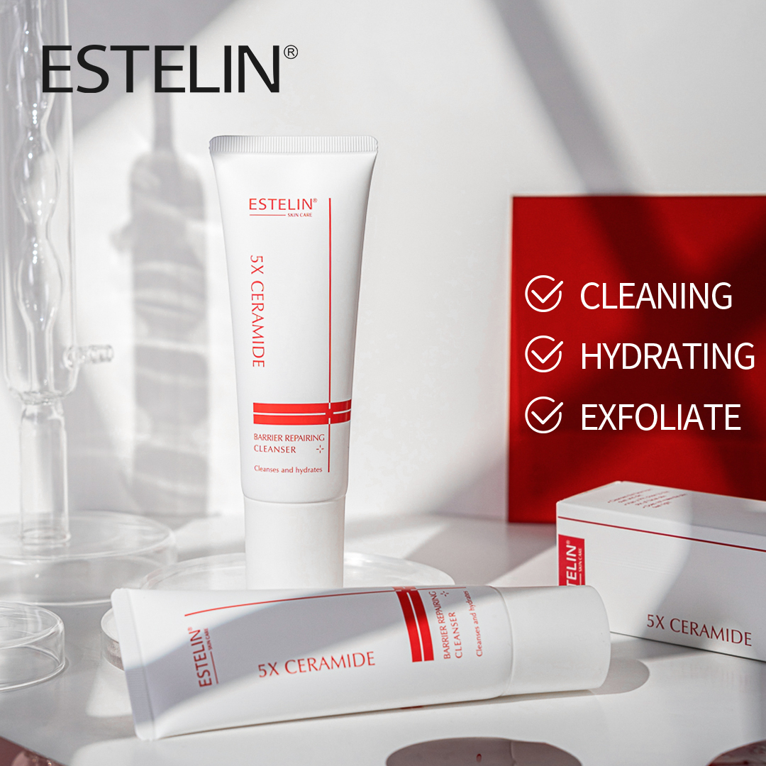 The Estelin 5X Ceramide Barrier Repairing Cleanser is a dermatologist-inspired formula that combines five ceramides, Hyaluronic Acid, and Centella Asiatica extract. It effectively removes dirt, oil, and impurities without stripping the skin of essential moisture. Ceramides strengthen the skin barrier, Hyaluronic Acid replenishes hydration, and Centella calms irritation, making this cleanser ideal for sensitive, dry, or compromised skin.